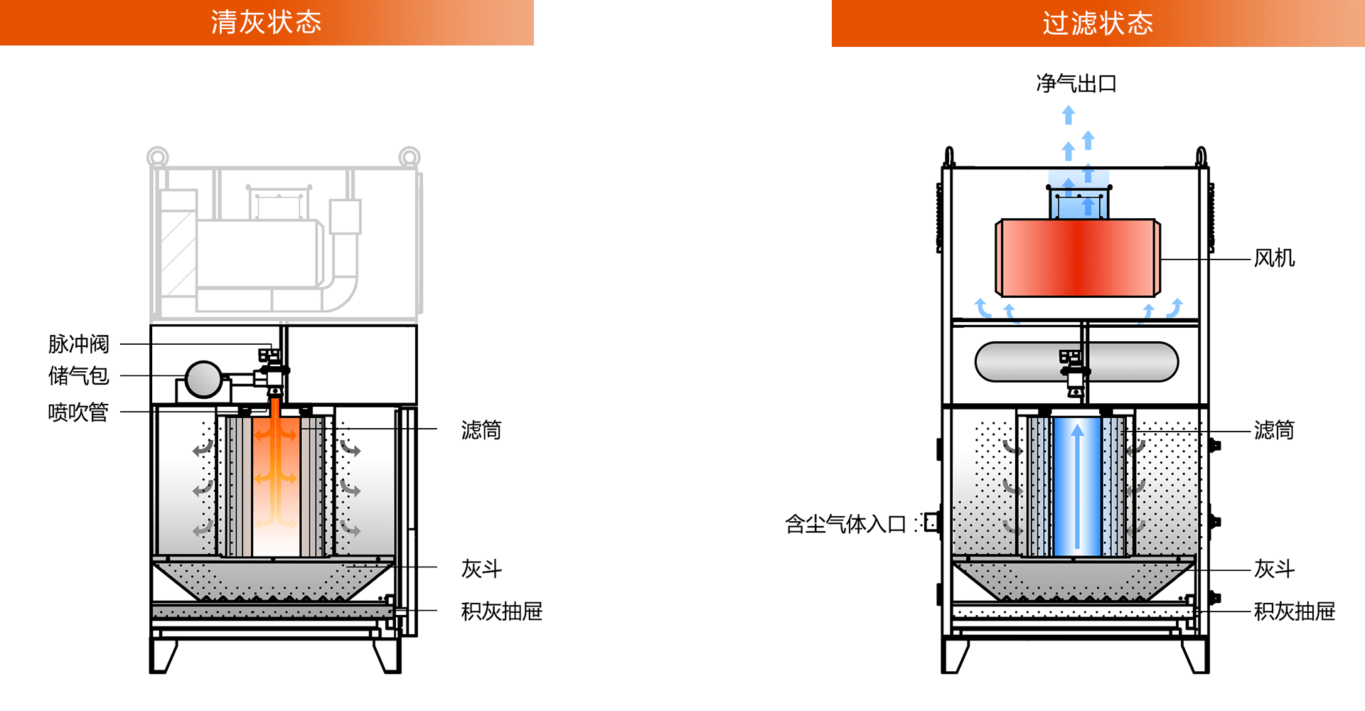 通過反復小幅度的沖擊振動,將積聚在濾筒外部的粉塵震落至灰斗內。